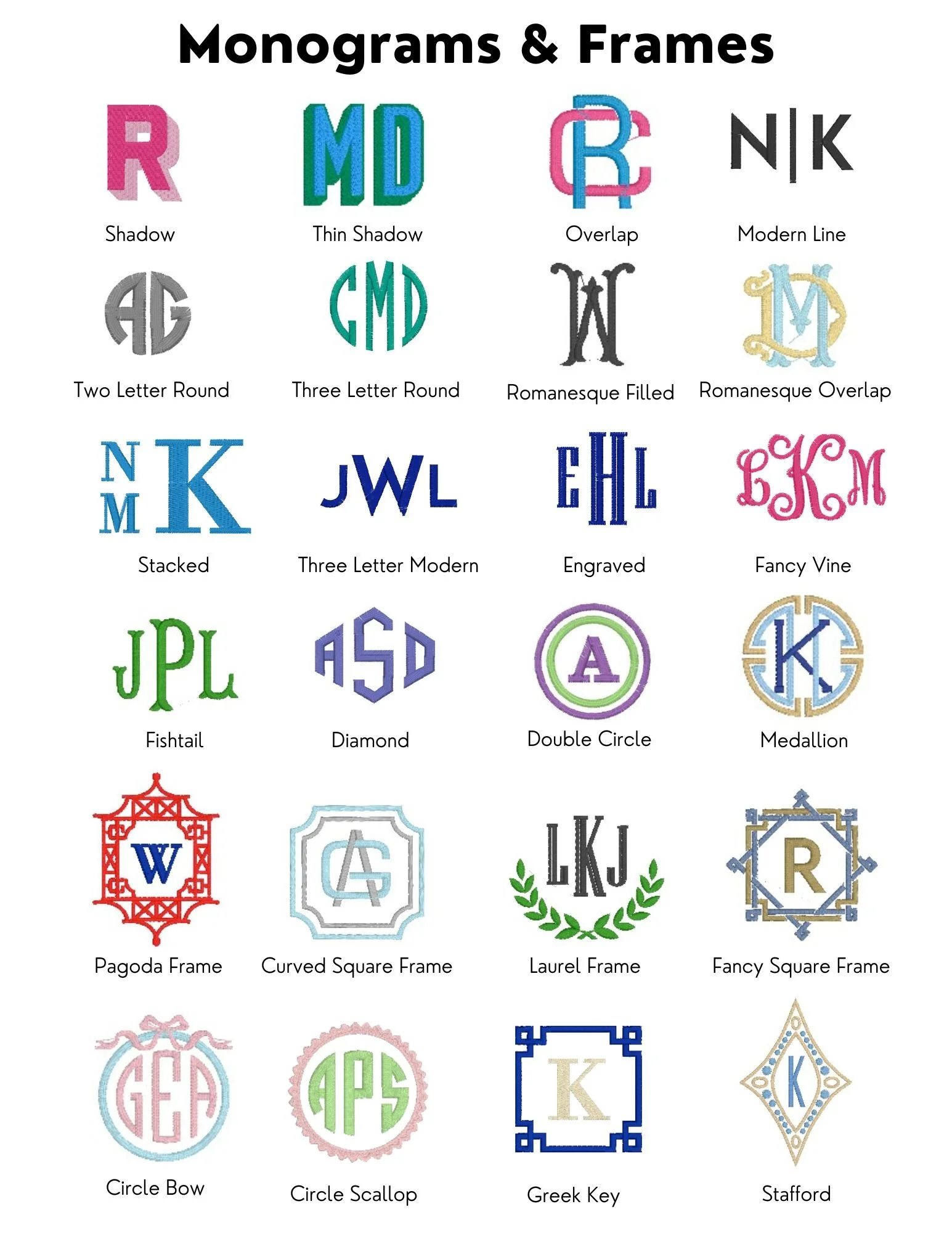 Use these to select what font selection and embroidery style you’d like to use on your product.